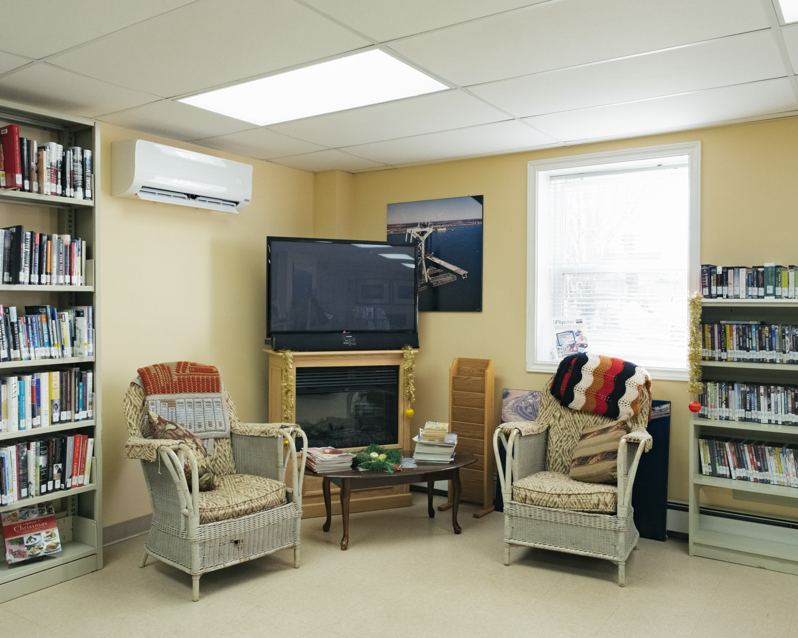 Nearly 90 years later, artist Doug Dumais repeated Bateson’s travels, photographing all twenty-five PEI libraries. The exhibition Circulations presents seven images from these journeys overlaid with text, stickers, and labels from scans of book jackets borrowed from the library system. The pairings are either thematic (W. G. Sebald’s Austerlitz, 2001), historical (Morell: It’s History, 1980), or political (Nora Bateson’s Rural Canada Needs Libraries, 1944).